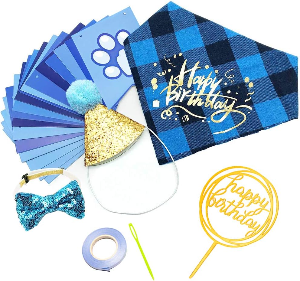 LOVELY DOG BIRTHDAY PARTY SUIT – Our Pet Dog Birthday Bandana Set Includes: 1 * Blingbling Birthday Hat, 1 * Classic Plaid Scarf, 1 * Adorable Bowtie, 1 * Happy Birthday Banner, 1 * Cake Topper to celebrate the birthday of your beloved dog.
